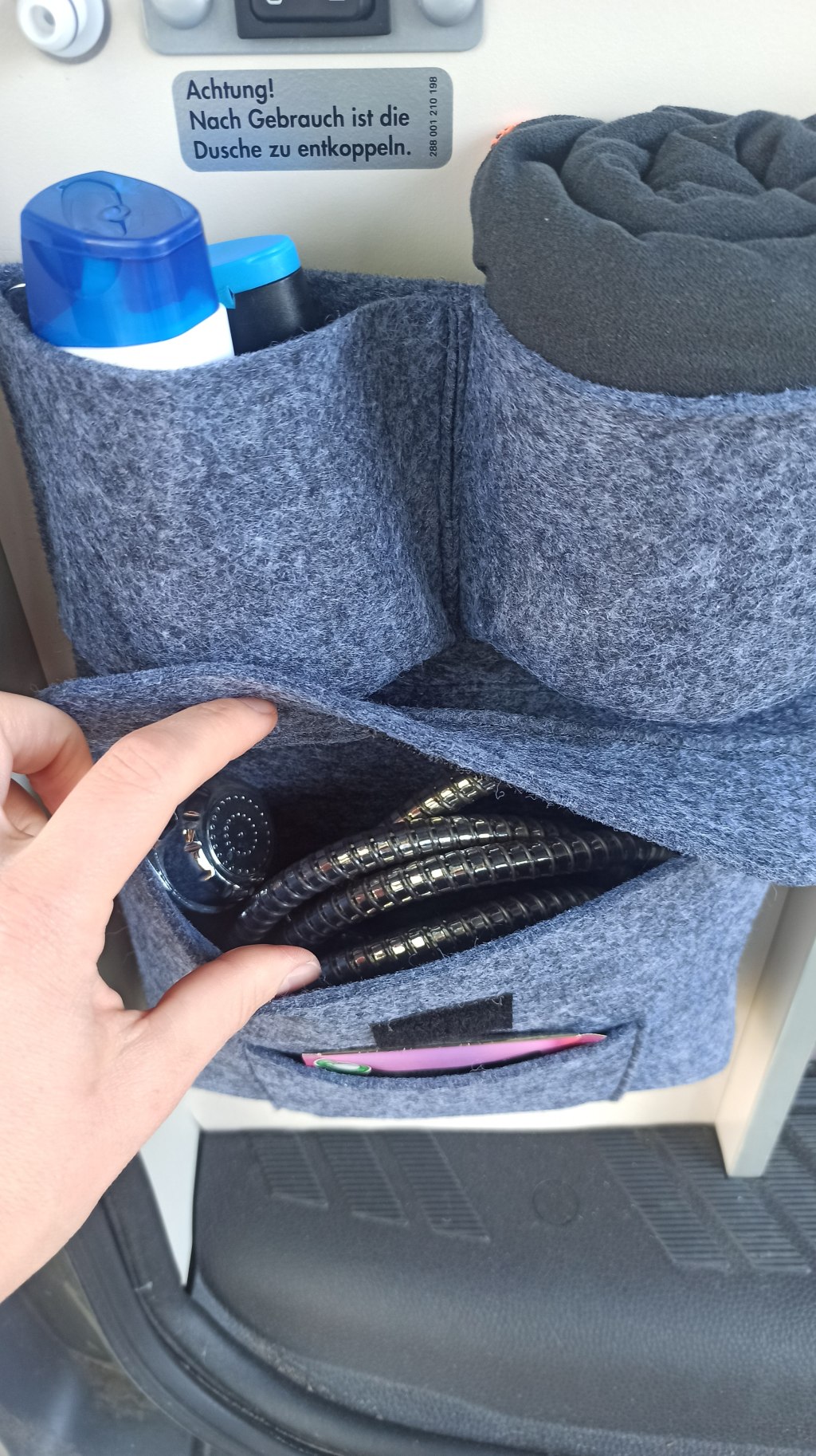 Der Kaltduscher eignet sich optimal als Hecktasche unterhalb der Duschvorrichtung. Er kann aber auch an anderen Stellen angebracht werden.